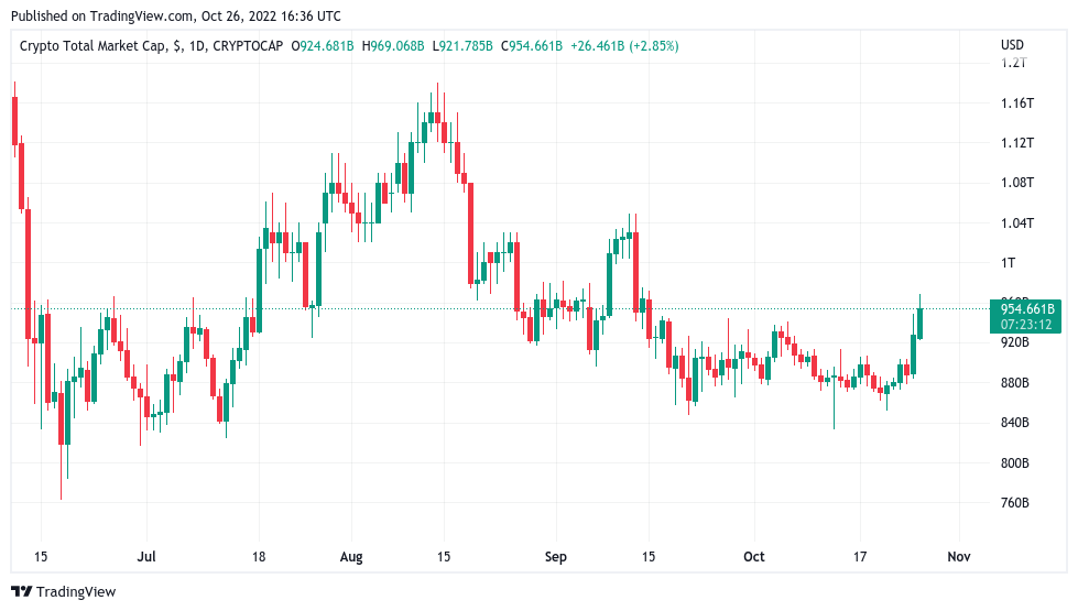 The overall crypto market cap, which had lost significant value over the year, came within 5% of the $1 trillion mark on the day.