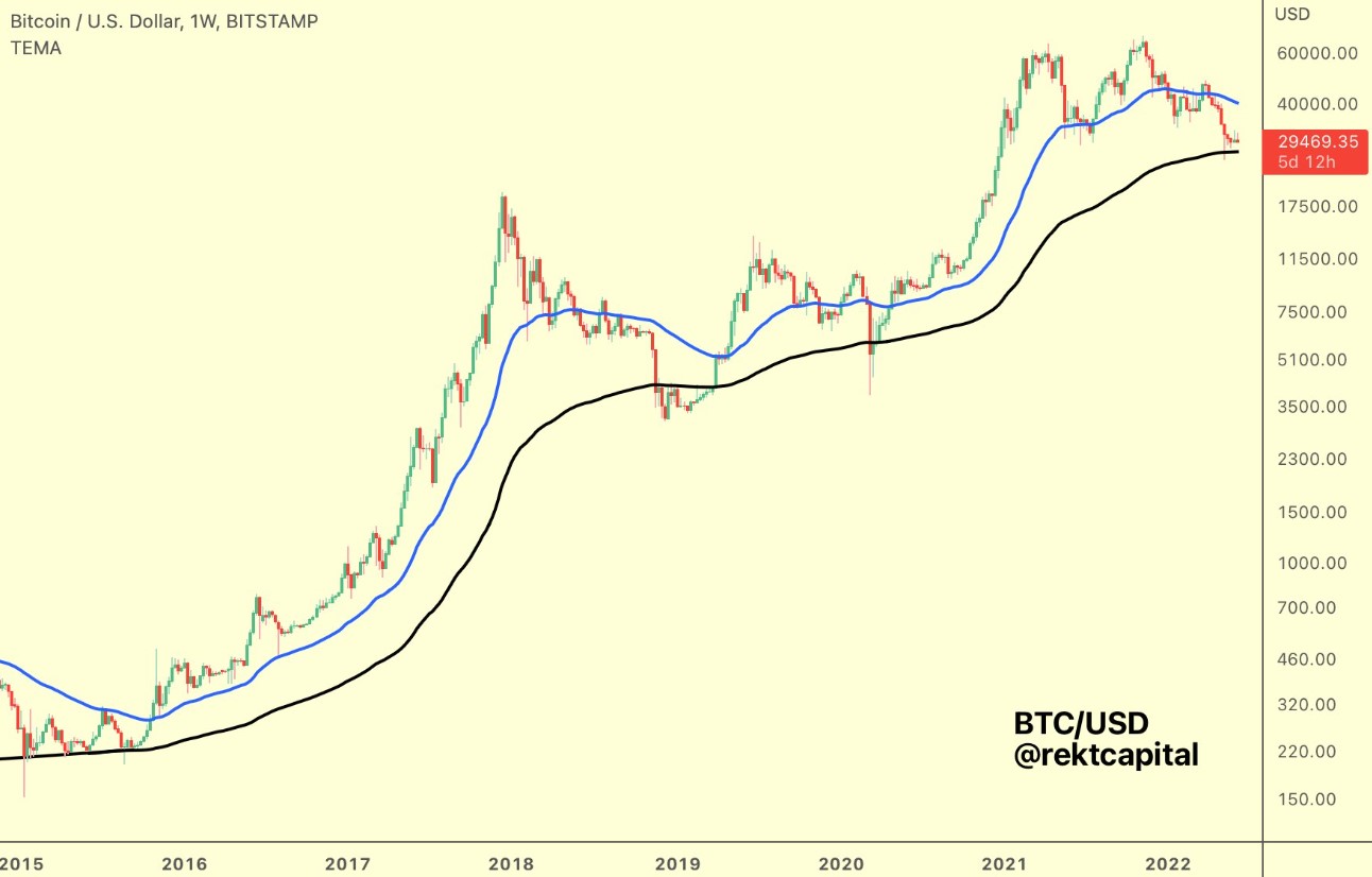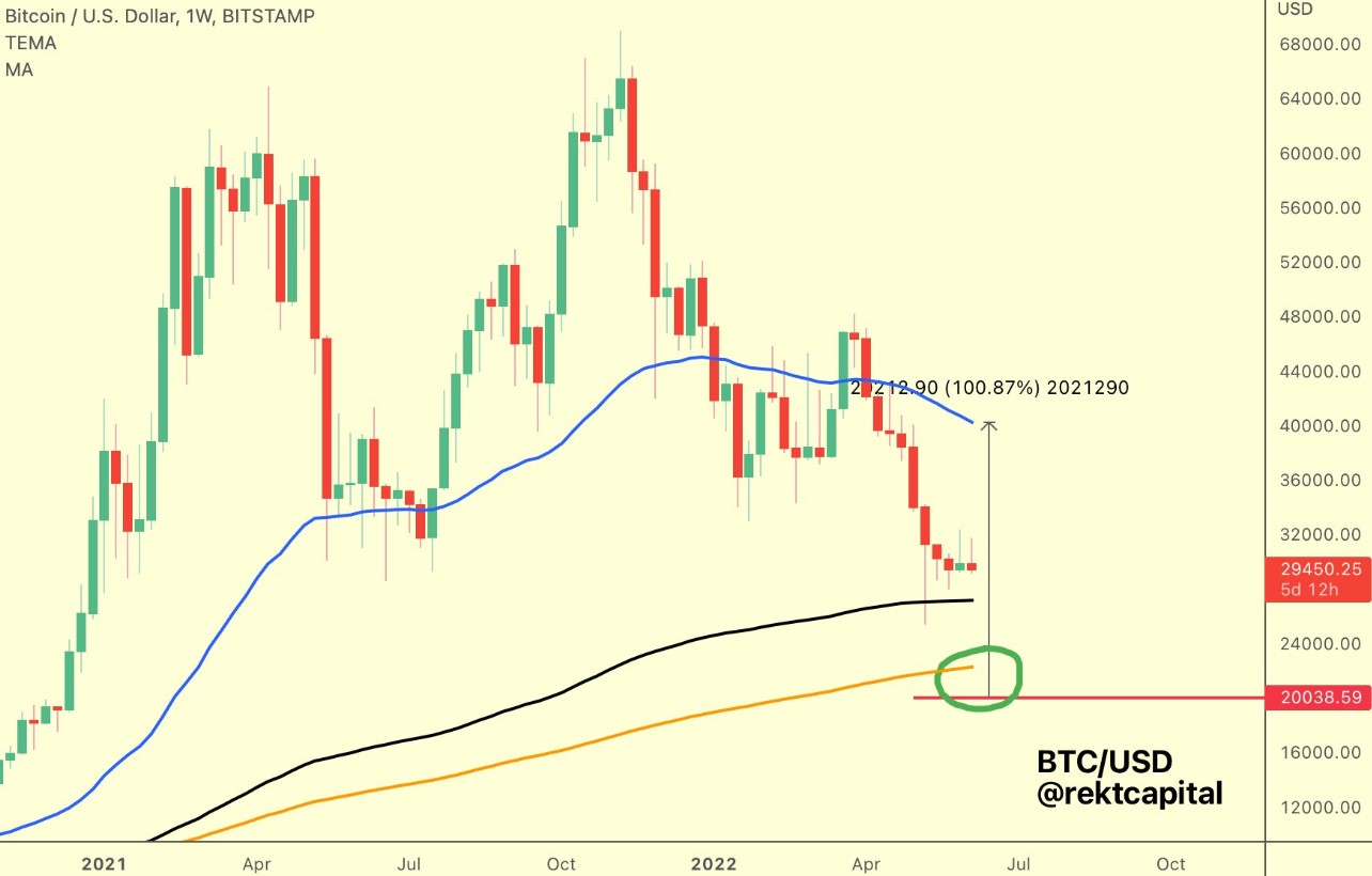 For traders trying to get some sense of where the bottom might be, market analyst and pseudonymous Twitter user Rekt Capital posted the following chart highlighting the 200-EMA (exponential moving average) as a key indicator to watch.