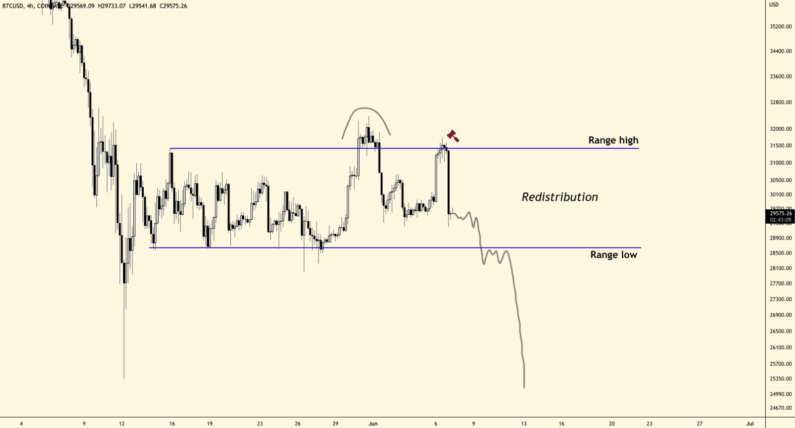 “What is happening inside the range and what has happened at the range high, shows that this is [a] clear redistribution range. Clean break of the range low = last leg down confirmed = 21K–23K.”