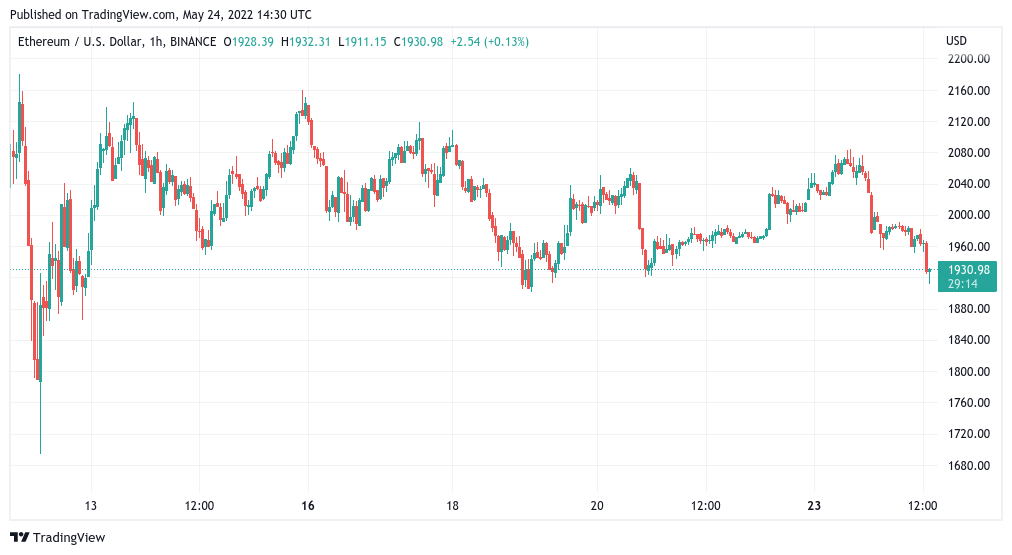 Ether (ETH) lost $2,000 to trade at around $1,920 at the time of writing and approaching its last line of support above the wick down to $1,700 lows seen last week.