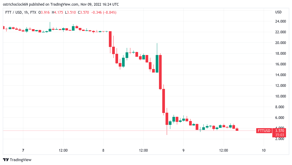 FTT/USD traded at just $3.60 on the day, down from $22 just two days previously, leading to comparisons with the Terra LUNA debacle.