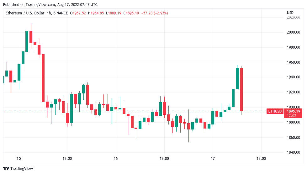 On altcoins, Ethereum (ETH) briefly came within $50 of the $2,000 mark once more before reversing lower in step with BTC.