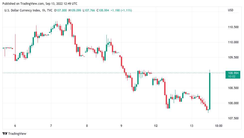 The U.S. dollar index (DXY), strength in which traditionally means headwinds for crypto, saw a flash rebound on the CPI news, passing 109 for the first time since Sep. 9.
