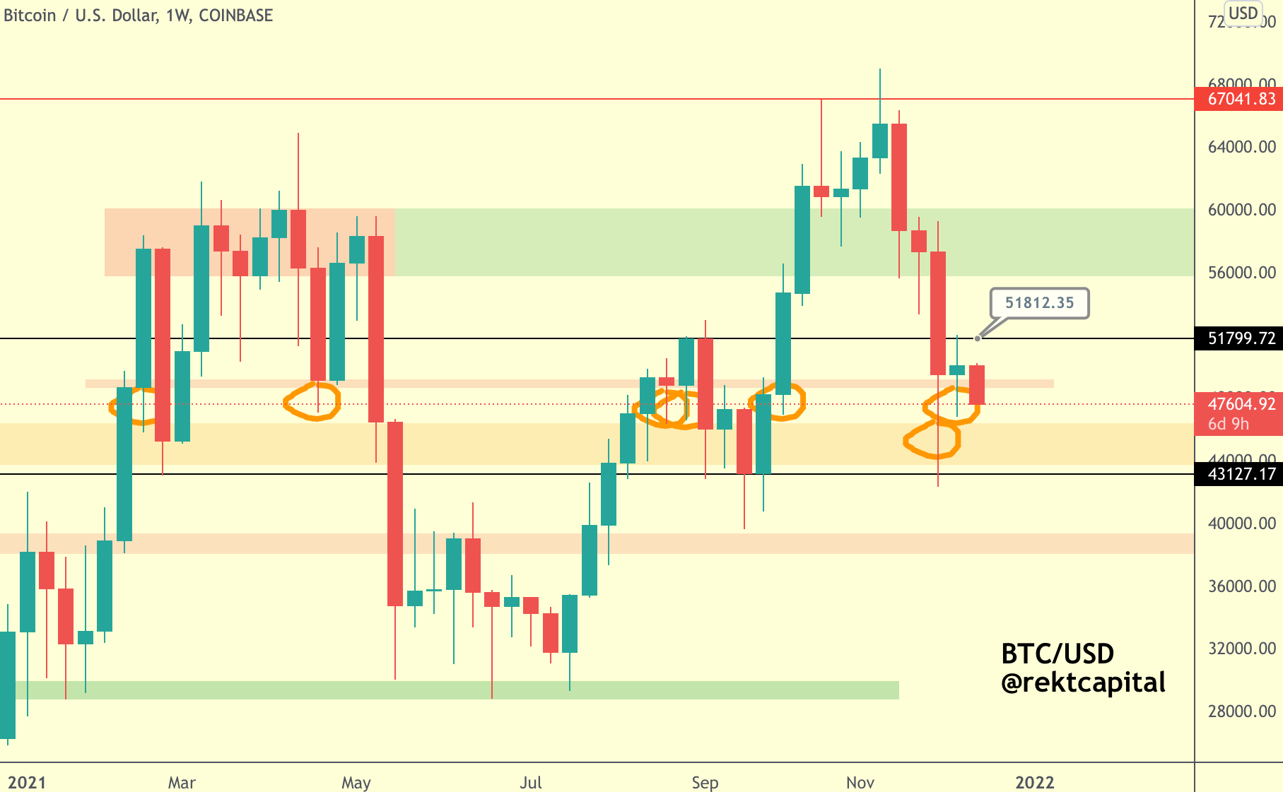 A final word of reassurance was provided by market analyst and pseudonymous Twitter user Rekt Capital, who posted the following chart and noted that “BTC downside wicking below the red weekly support area has happened many times in the past (orange circles).”