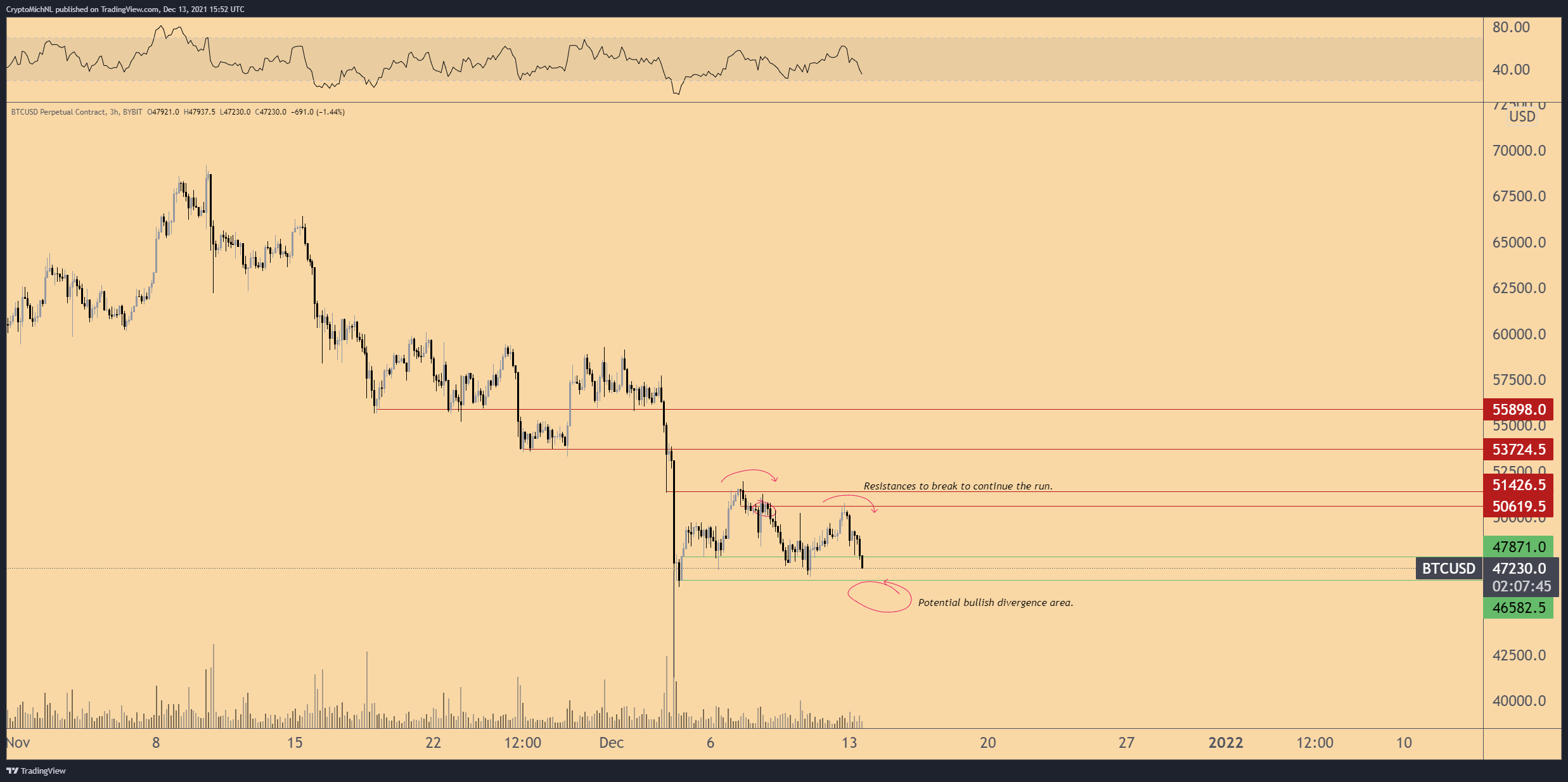 “Looks to me as if we’re looking for a bullish divergence to be created beneath the $46.5K area in order to have a reversal possible.”
