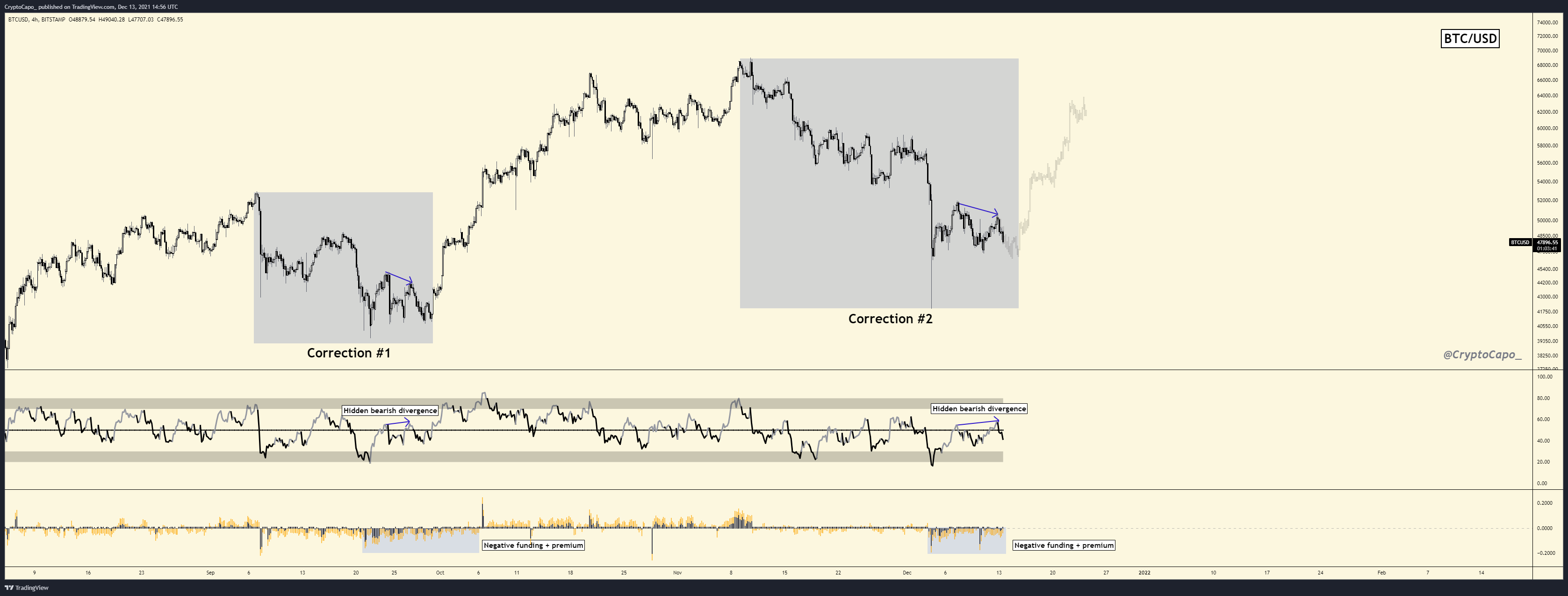 “These two corrections are very similar. Same 3 wave move pattern. Same bottom formation (3 touches). Same funding+premium negative rates. Same hidden bearish divergence before the last leg down.”