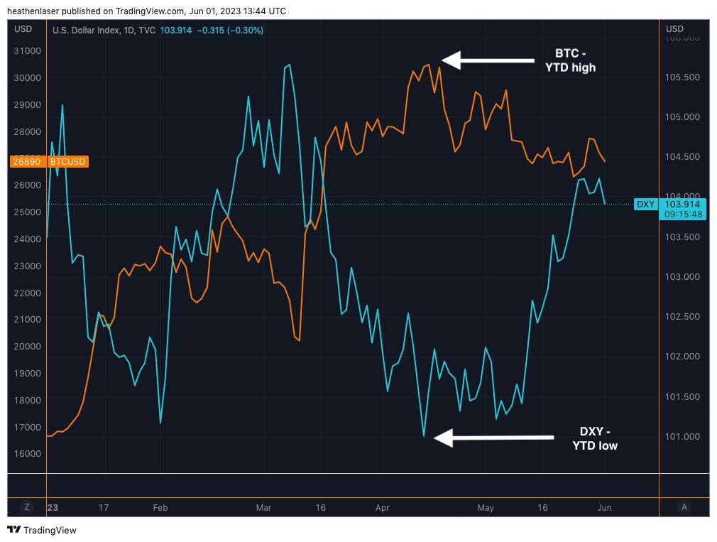 Notice how, Bitcoin’s 2023’s performance has been propelled by a downward dollar. Not coincidentally, DXY reached its year-to-date low near 100.80 on April 13, nearly the exact date BTC reached its year-to-date high of just over $31,000. Since then, however, both have been trending in opposite directions.