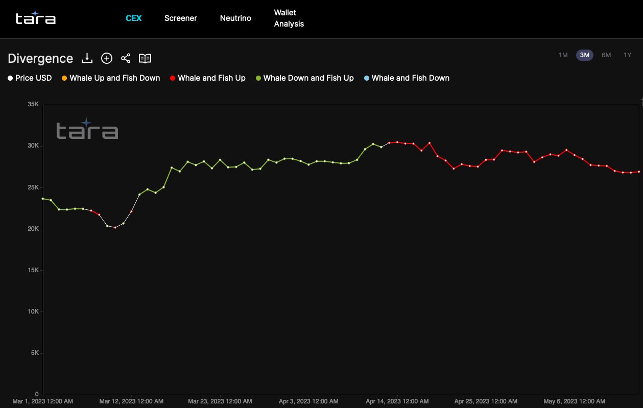 As shown on the chart below, Bitcoin whales (represented by the red dots) have been steadily increasing their holdings on net every day since April 17, a trend which coincided with Bitcoin reaching its year-to-date high above $31,000.