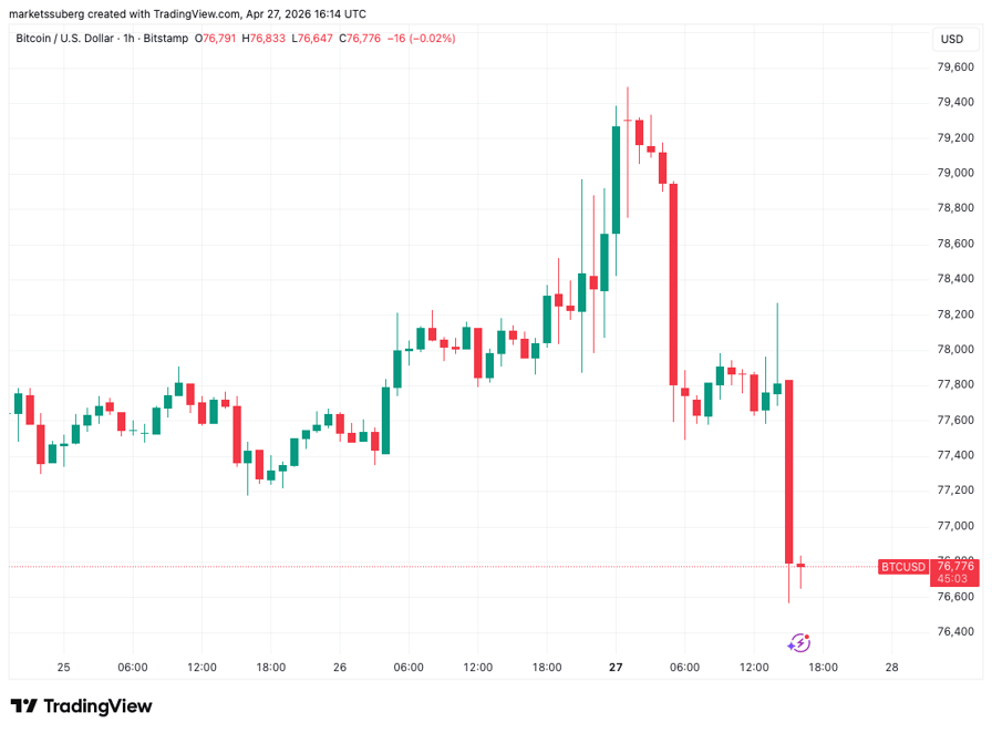 Data from TradingView showed BTC/USD hitting local lows of $76,567 on Bitstamp, giving back earlier gains.