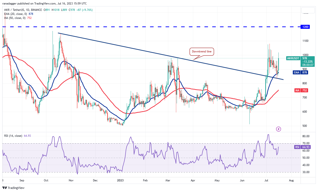 The upsloping 20-day EMA ($878) and the RSI in the positive zone signal that bulls are in control. Buyers are attempting to resume the up-move but may face stiff resistance near $1,100. If bulls clear this hurdle, the MKR/USDT pair may soar to $1,200.