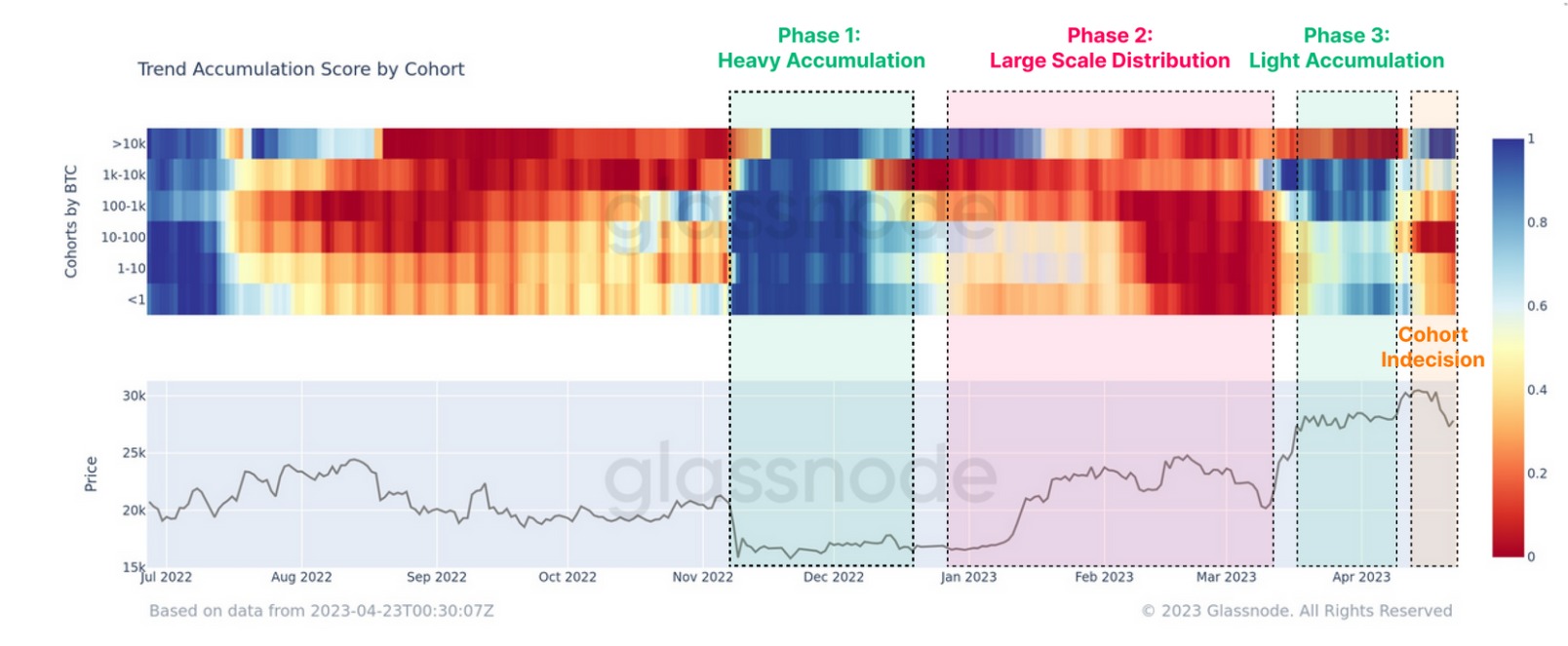 “With accumulation and distribution behavior across several wallet cohorts mixed at the moment, the market appears less decisive than it has been in the first quarter of the year.”