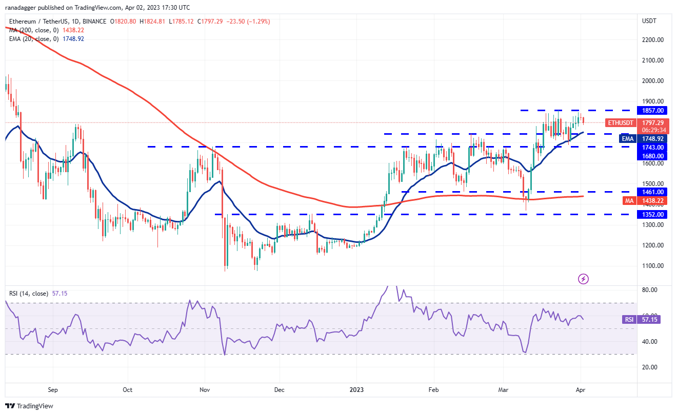Ether (ETH) turned down from the overhead resistance of $1,857 on April 1 but the bulls are not giving up much ground. This suggests that the buyers are not rushing to the exit.