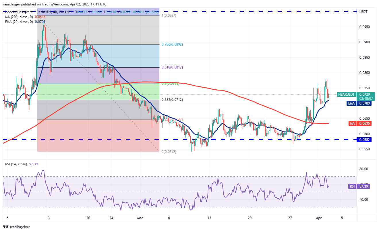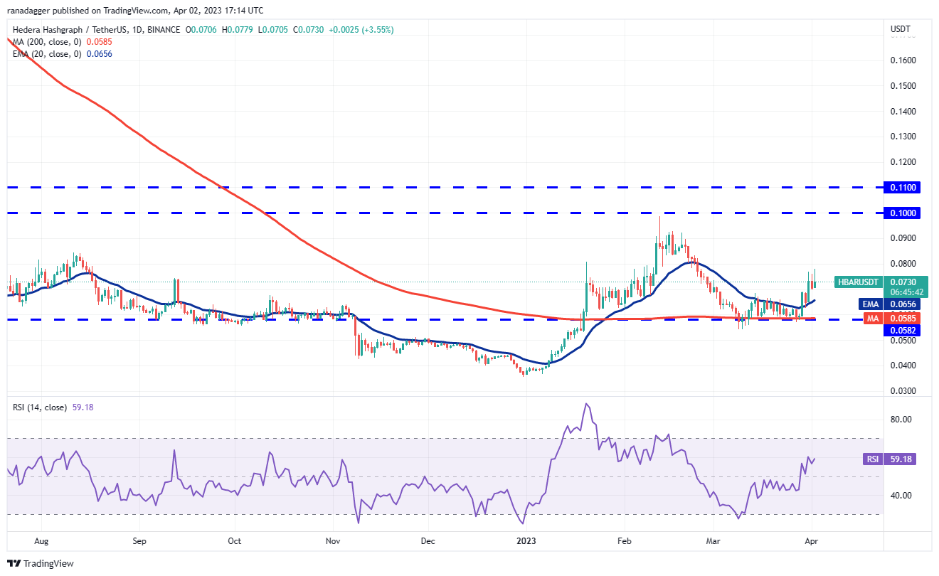 Buyers foiled several attempts by the bears to sink and sustain Hedera (HBAR) below the 200-day SMA ($0.06) between March 9 to 28.