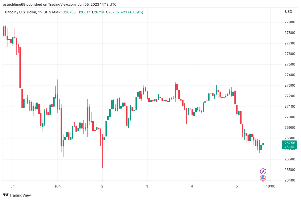 “Bitcoin is, still, stuck in the range-bound area where $26,600 is the important area to hold,” Michaël van de Poppe, founder and CEO of trading firm Eight, told Twitter followers on the day.