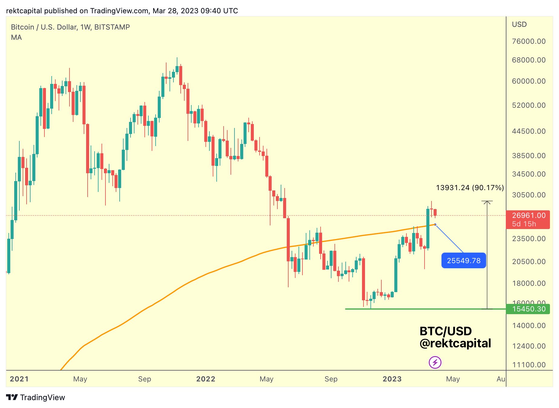 Technical Support at the 200 Week Moving Average is currently ~$25,550, and resistance is at $30k