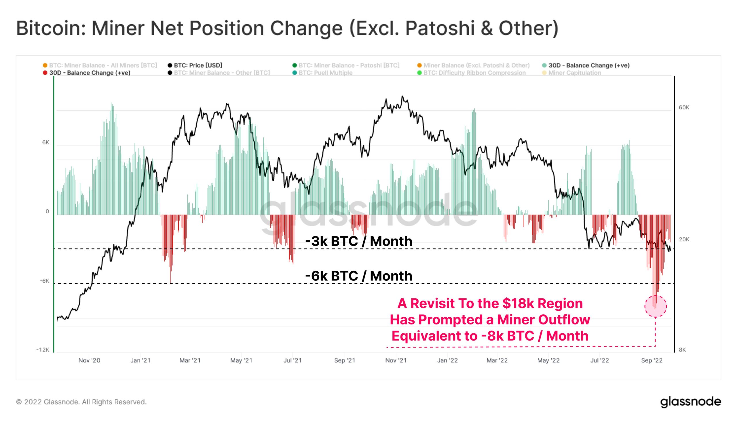 Bitcoin miner balance has seen large outflows since prices were rejected from the local high of $24.5k, suggesting aggregate miner profitability is still under a degree of stress. While the miner outflow has ranged between 3k BTC – 8k BTC, however, market data indicate that a price decline to $18,000 could lead to a monthly outflow of 8K BTC.