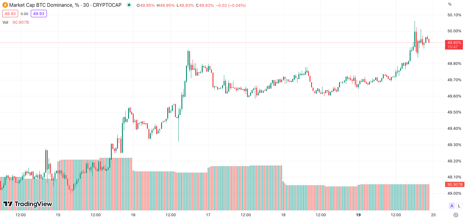 On June 19 at 6 pm UTC, Bitcoin dominance hit just above 50% and has since settled to 49.9% at the time of publication, according to data from TradingView.