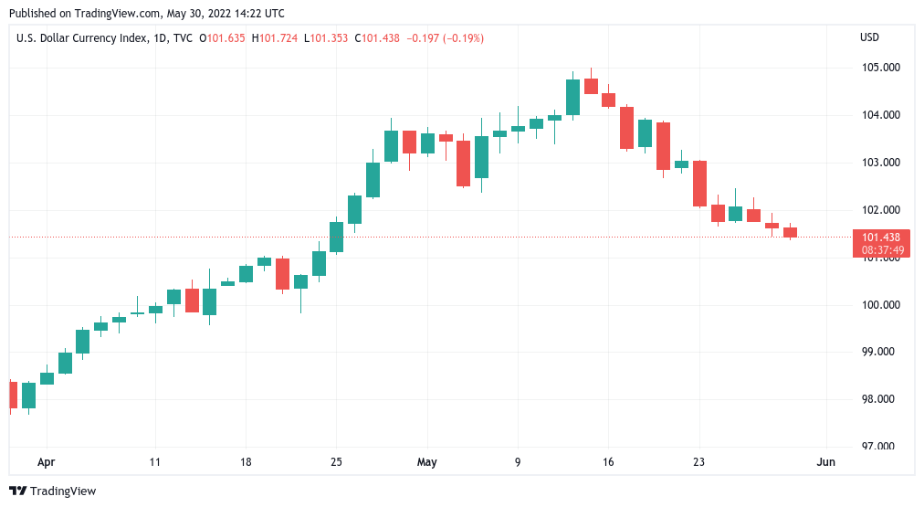 The U.S. dollar index (DXY) retreated for another day, breaking below 101.5 for the first time since late April.