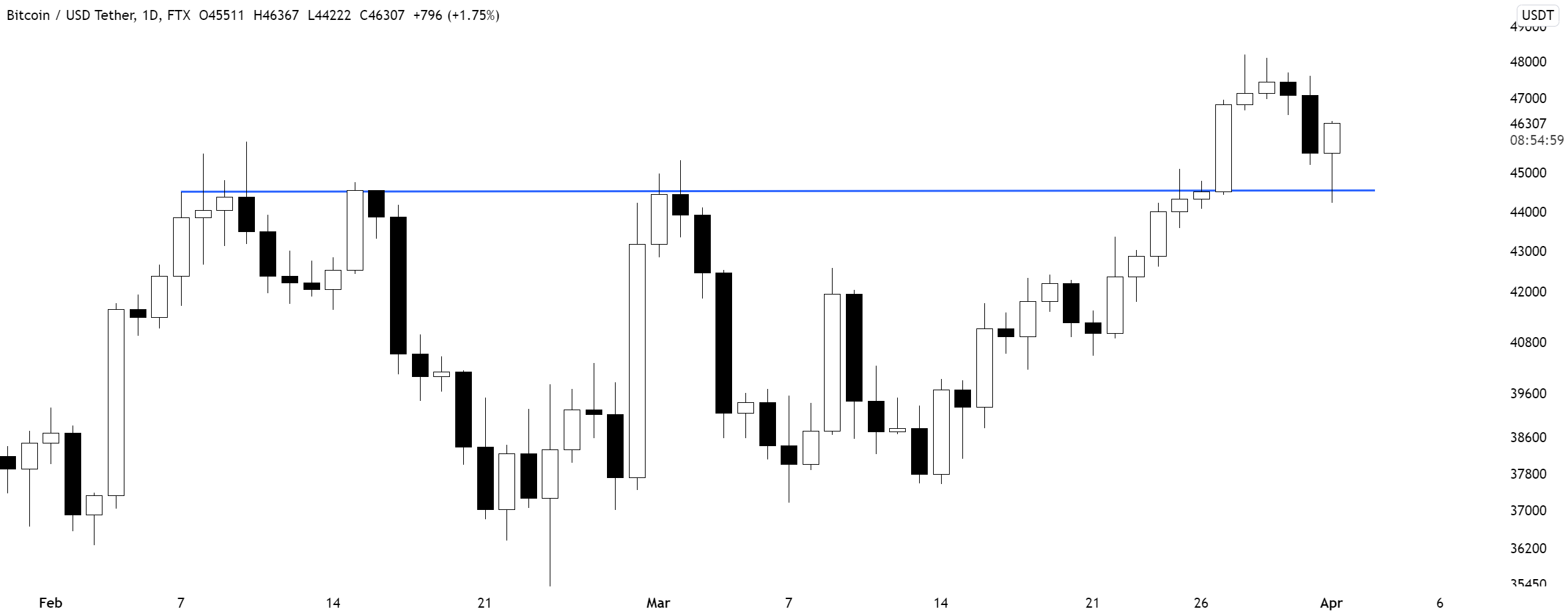 Despite the pullback on March 31, Lifchitz indicated that “the upside support trendline from March 21 remains intact,” and will likely hold as support moving forward barring “a revisit of the low $40,000s in the next couple of days.”
