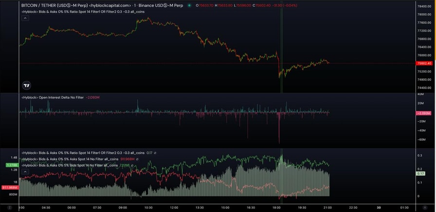 “The global bid ask ratio spiked to 0.3 (one of the highest readings), while open interest fell on the price drop. This is classic post-FOMC position squaring and stop-hunt behavior rather than conviction selling.”