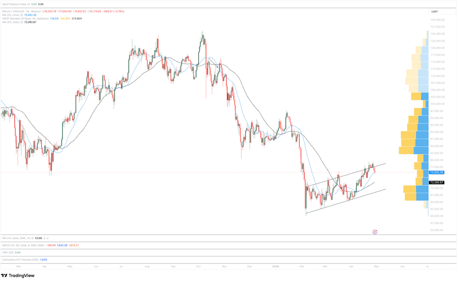 As reported on Monday by Cointelegraph, following the break above the channel resistance on the daily chart, BTC required consecutive daily candle closes above the trendline, followed by a lower support restest in the $76,500 to $75,500 range.