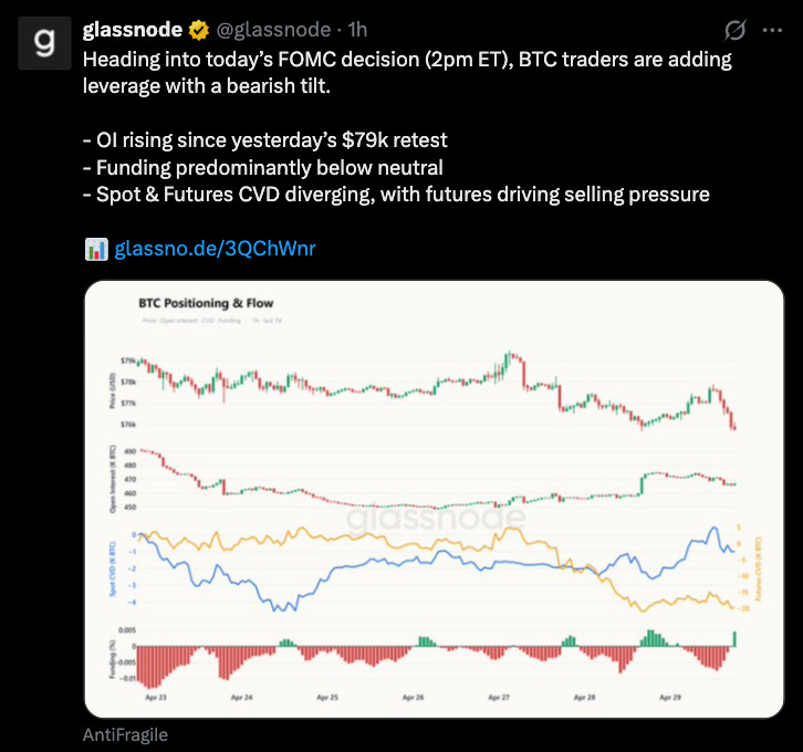 Prior to the Chairman Powell’s presser, Glassnode analysts noticed that Bitcoin traders were adding bearish leverage, citing rising open interest after Tuesday’s rally to $79,000, funding remaining neutral and a divergence between the spot and futures market cumulative volume delta (CVD).