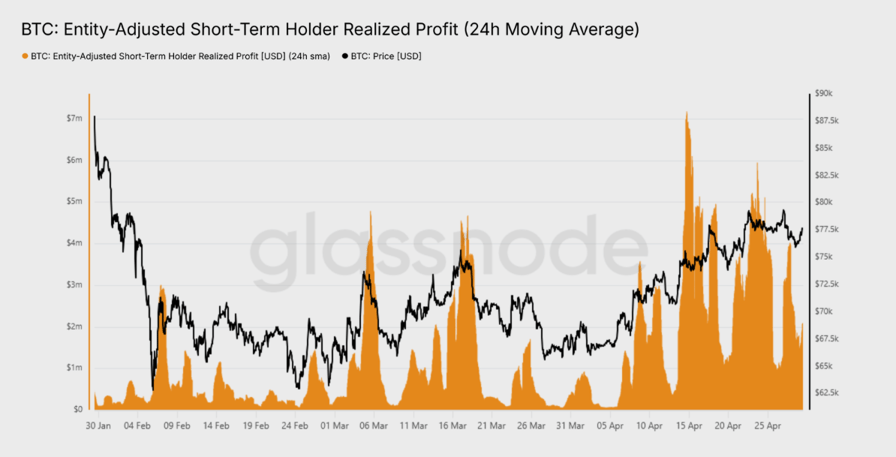 BTC entity-adjusted short-term holder realized profit. Source: Glassnode