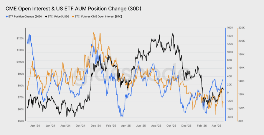 CME open interest, US spot ETF AUM position change. Source: Glassnode