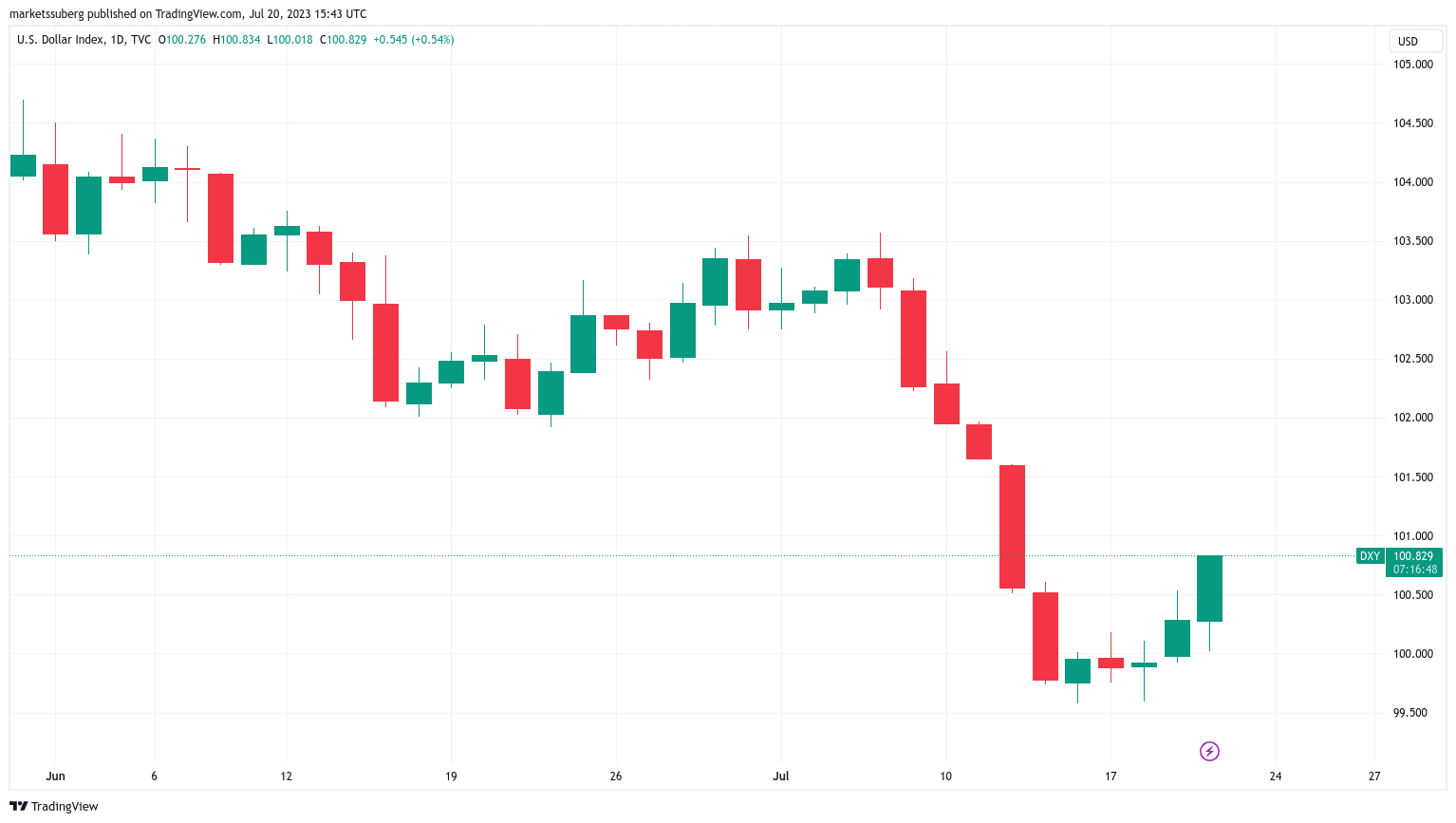 The impact on the U.S. dollar was pronounced, the U.S. dollar index (DXY) gaining ground to near 101 for the first time in several days.