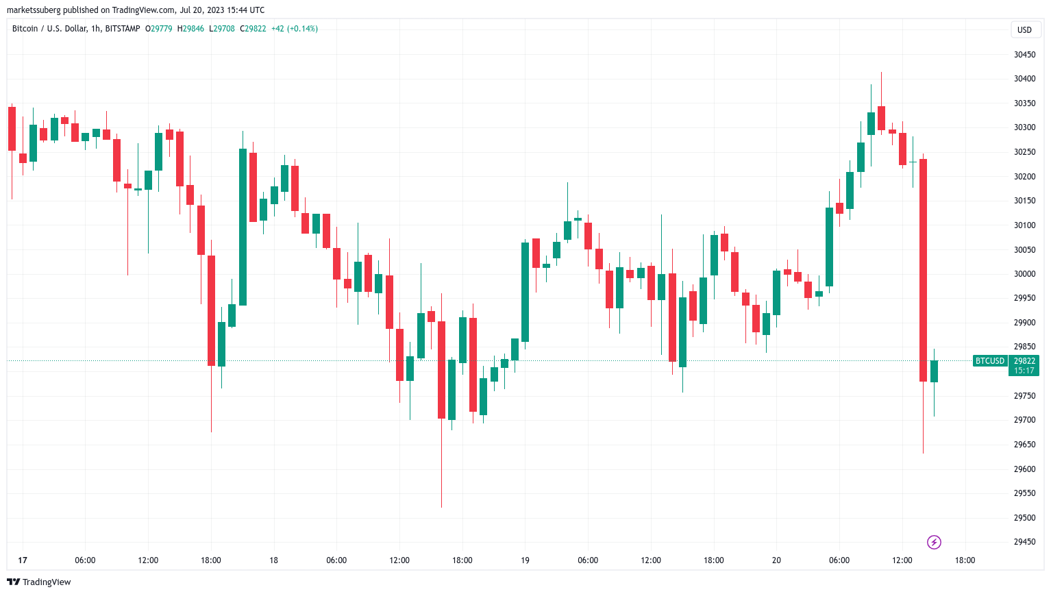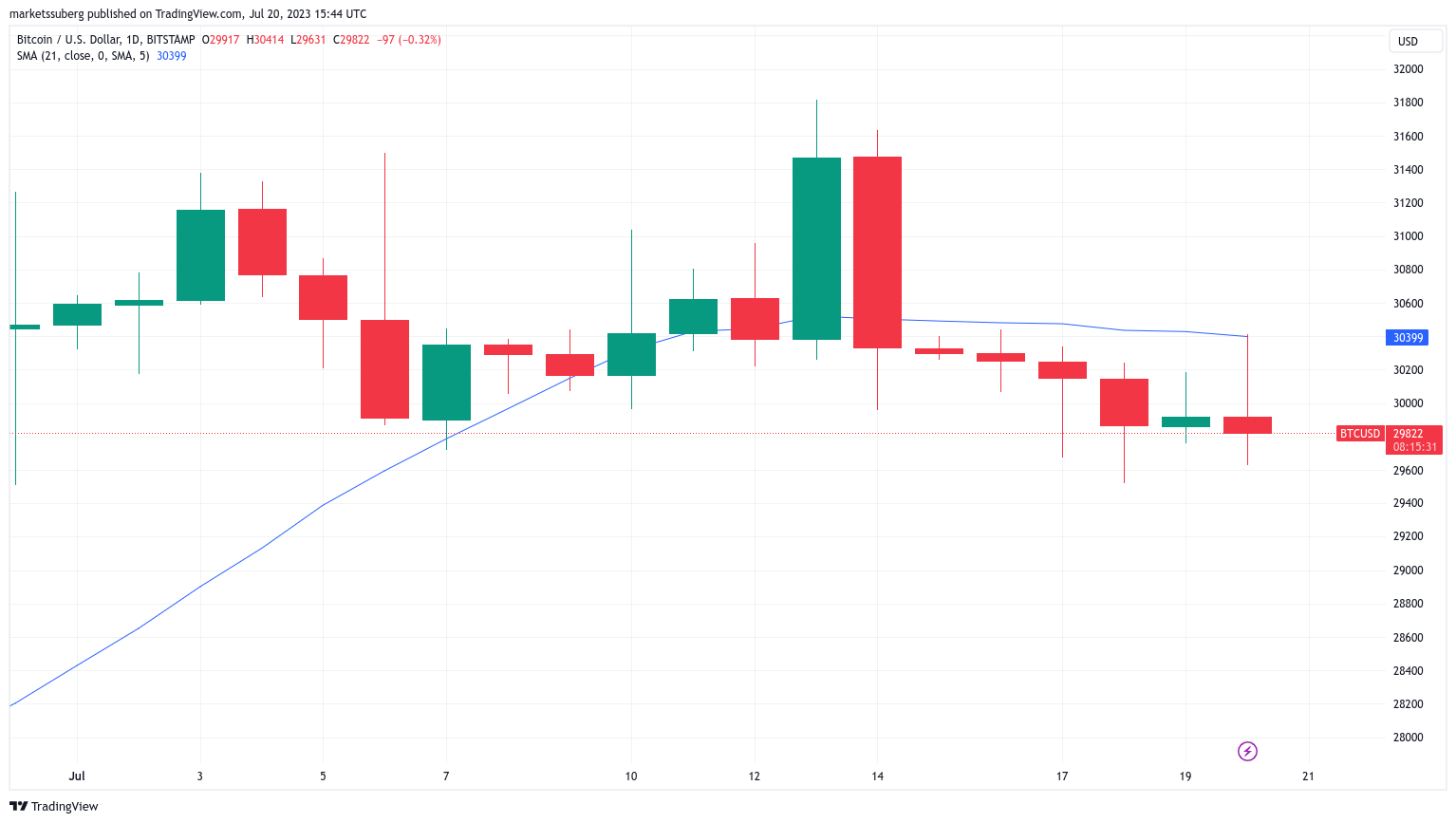 Bitcoin (BTC) failed to hold above $30,000 after the July 20 Wall Street open as one analyst forecast a return to range lows.