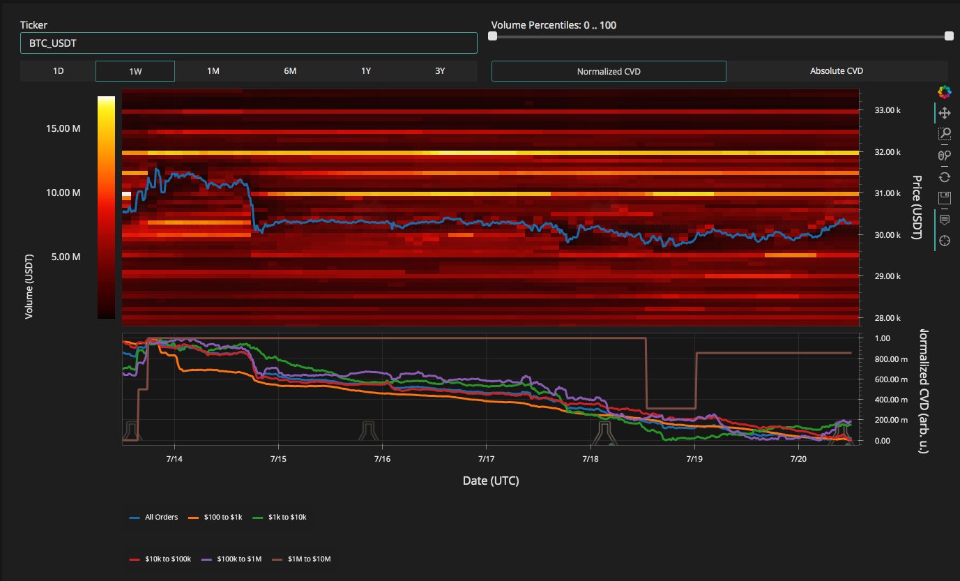 A prior print of the Binance BTC/USD order book showed a lack of bid liquidity immediately below the $30,000 mark.