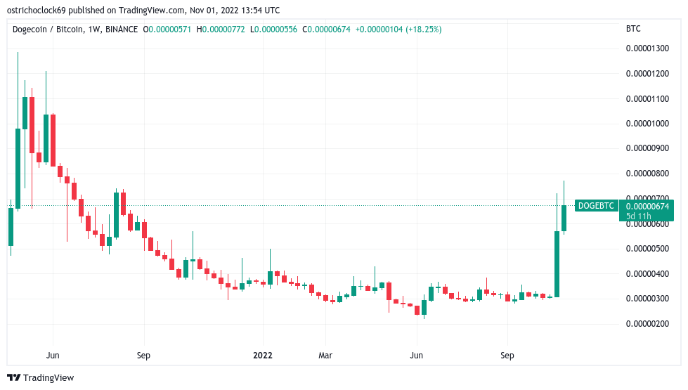 Continuing a boost received courtesy of Tesla CEO Elon Musk, Dogecoin (DOGE) furthered gains on the day, reaching its highest since late April in USD terms and highest since June 2021 priced in BTC.