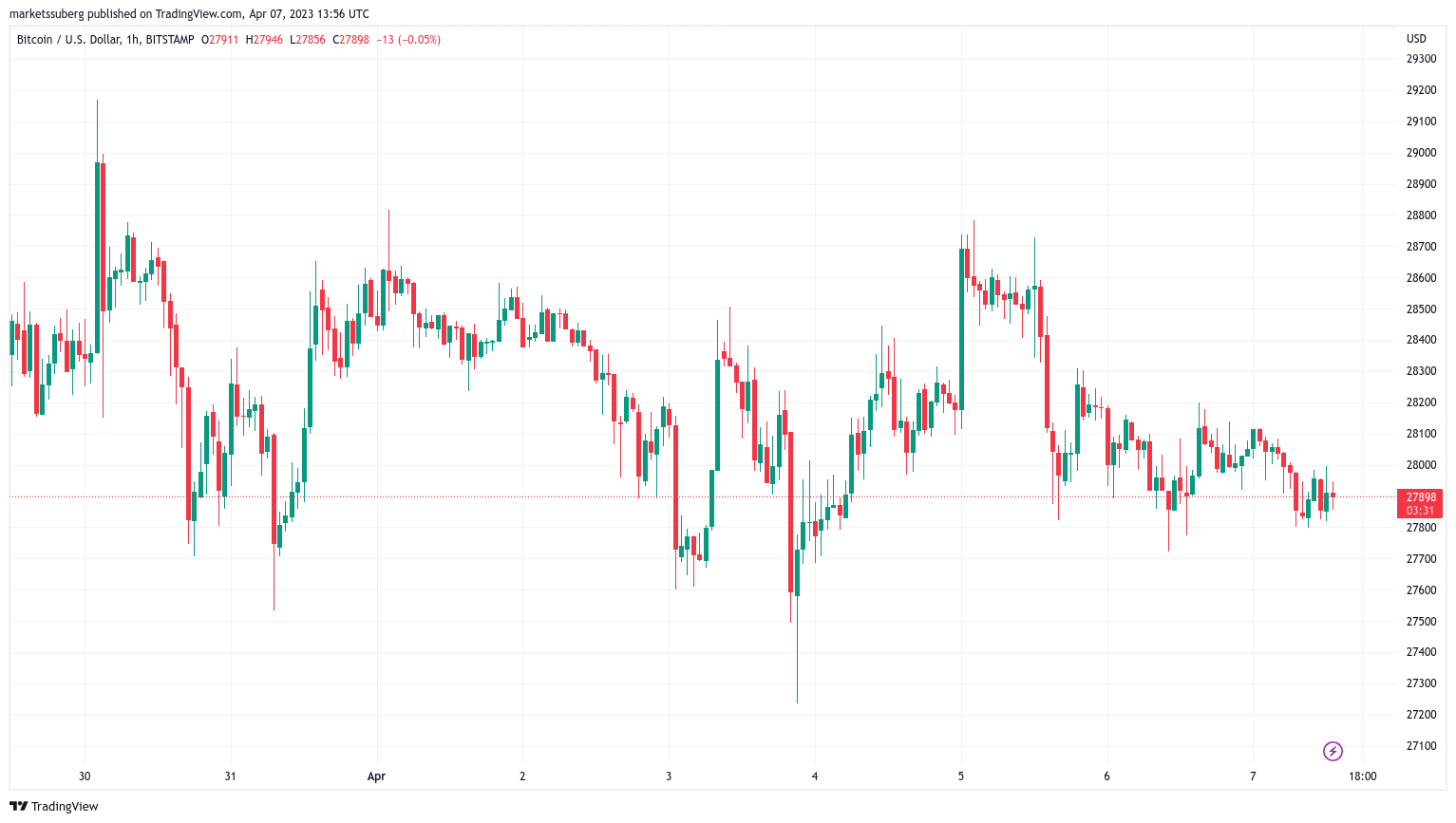 Data from Cointelegraph Markets Pro and TradingView followed BTC/USD as it drifted around $27,900 on Bitstamp.