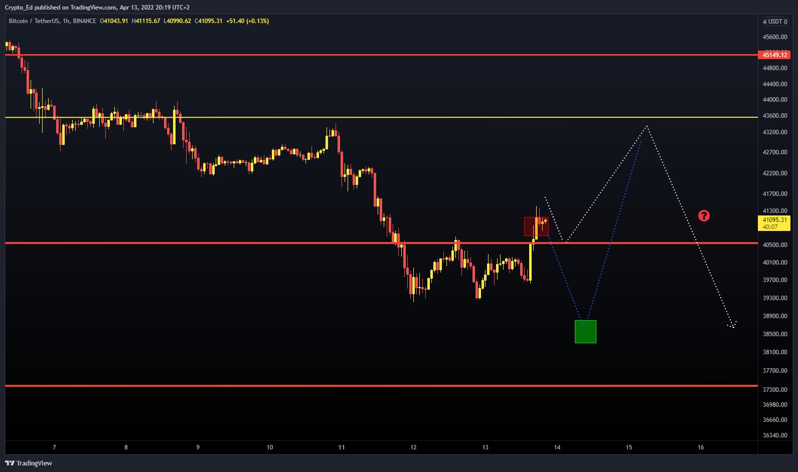 “Coming hours a bit more up, followed by a correction. Retest of 40.5k and when that holds, we’ll go for 42-43k (white). Lose 40.5k and we’ll go for green box.”