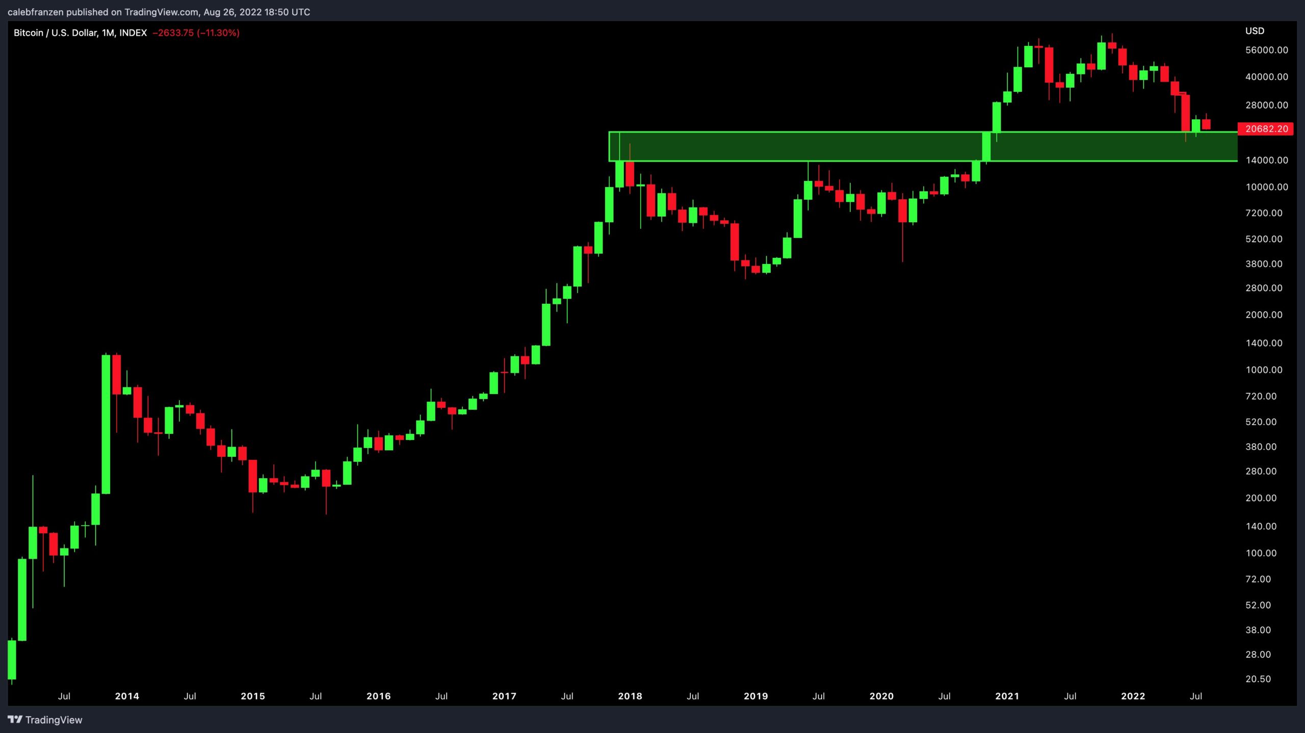“Bitcoin looks poised for a deeper retest of the key pivot range, identified by using the December 2017 monthly wick & close. This range acted as perfect resistance in 2019, acted as a launchpad in 2020, and has been attempting to act as support in 2022,” he explained about the monthly chart.