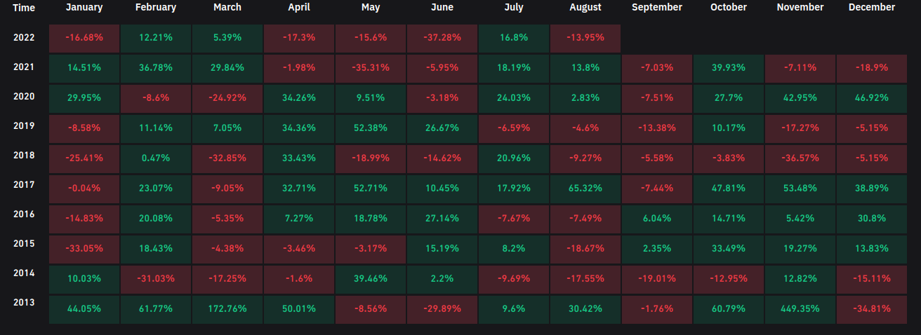 Data from on-chain analytics resource Coinglass shows that BTC/USD has not had an August this bad for seven years.
