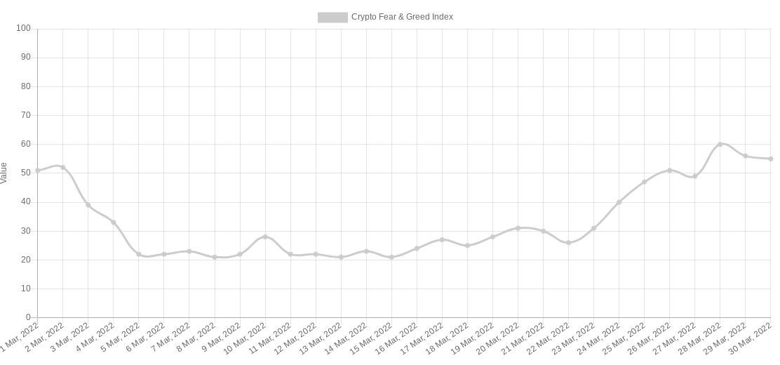 Since the local top, the score has already begun falling toward “neutral” territory, and measured 56/100 as of March 30.