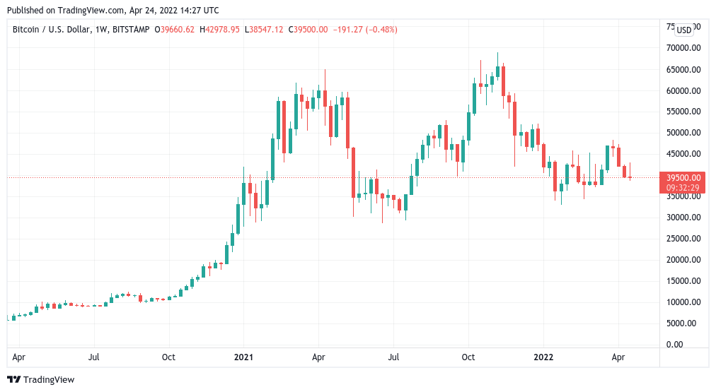 https://images.cointelegraph.com/images/840_aHR0cHM6Ly9zMy5jb2ludGVsZWdyYXBoLmNvbS91cGxvYWRzLzIwMjItMDQvYjBhODVlYjAtMGNkMi00ZmFhLWI0NjYtMGQ0Njc4ZjEwZjI3LmpwZw==.jpgBitcoin (BTC) stayed below $40,000 on April 24 as the weekly close looked set to be a painful one for bulls.