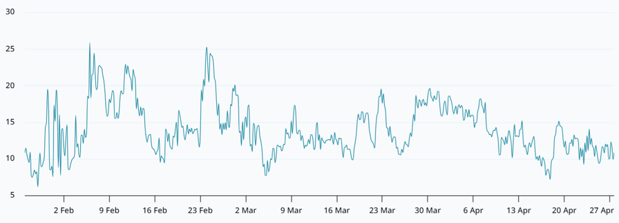 Bitcoin options 30-day delta skew (put-call) at Deribit. Source: Laevitas