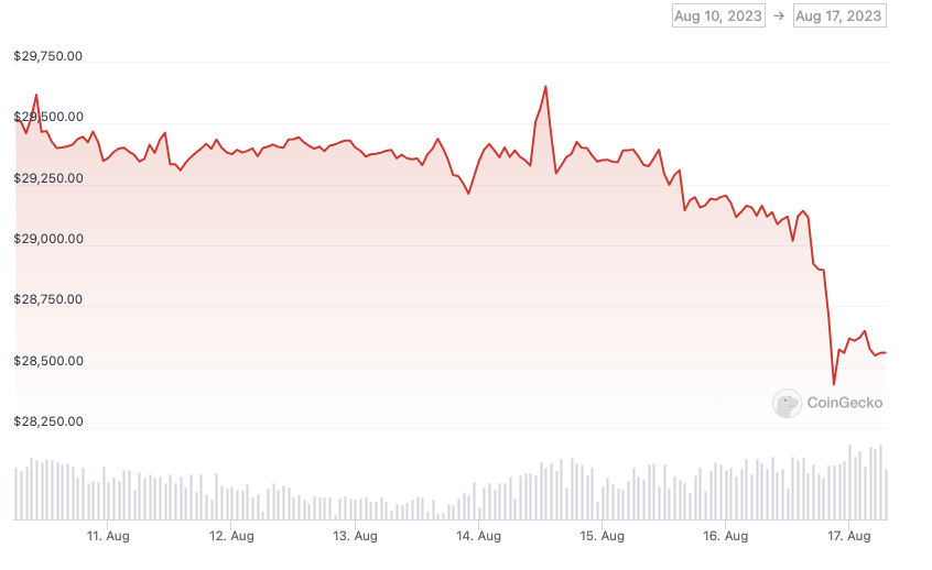 Since Aug. 14, Bitcoin has lost 3.7% of its value versus the U.S. dollar, dropping below the psychological mark of $29,000 on Aug. 16, according to CoinGecko. The cryptocurrency has been gradually tumbling over the past 30 days, dropping nearly 5% over the period at the time of writing.