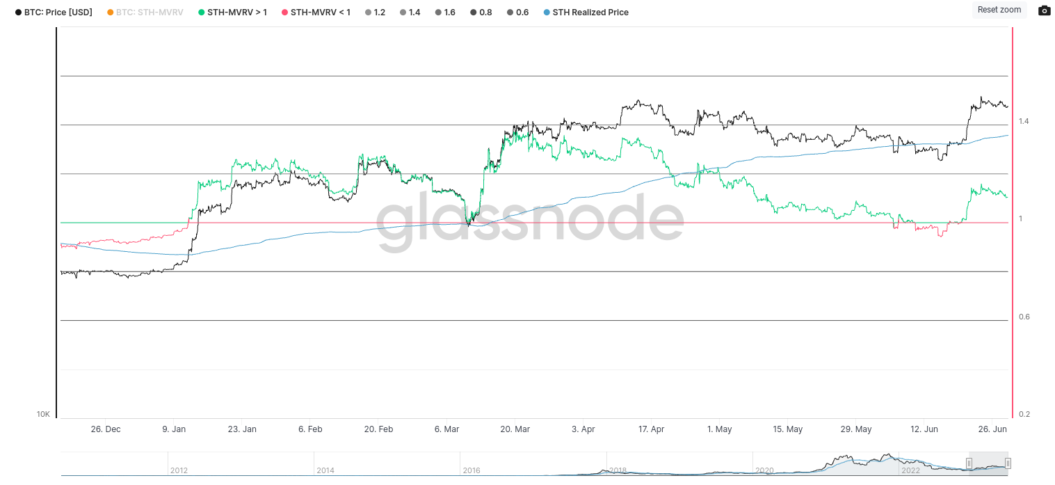 Current data shows STH profitability at around 10%, with their realized price — the price at which STH coins last moved — now above $27,000.