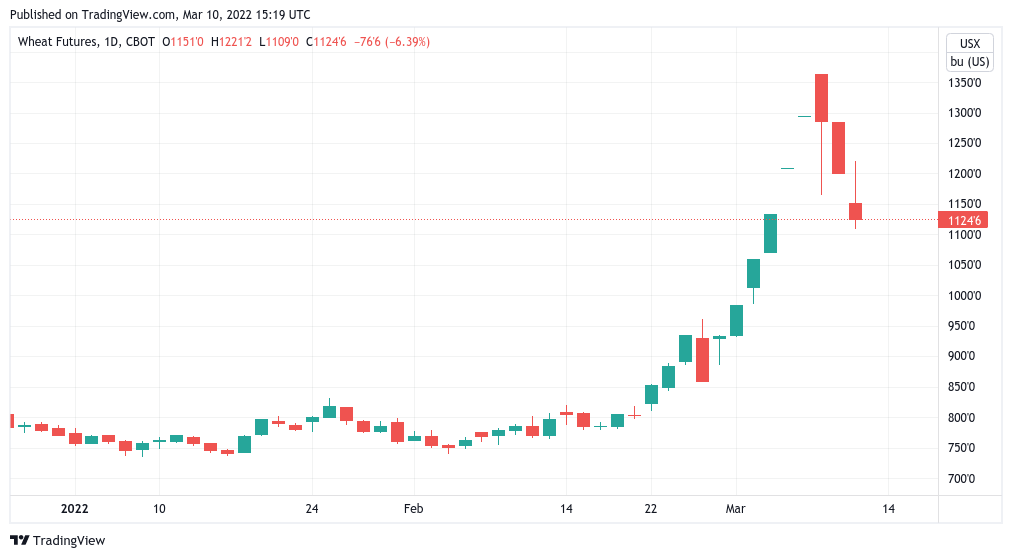 The S&P 500 was down 0.6% at the time of writing, while burgeoning commodity prices — oil and wheat among others — remained center stage.