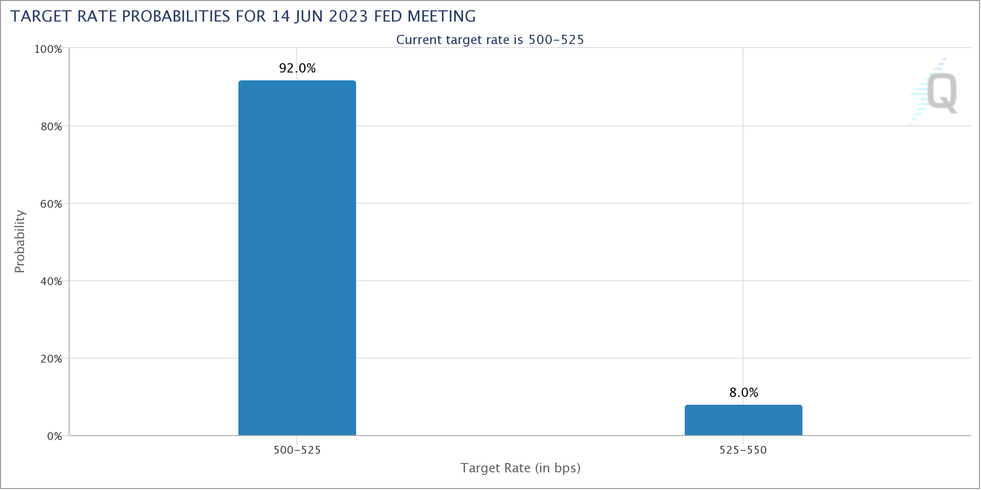 The latest data from CME Group’s FedWatch Tool continued to fall in line with the forecast, showing 92% odds of a rate hike pause at the time of writing.
