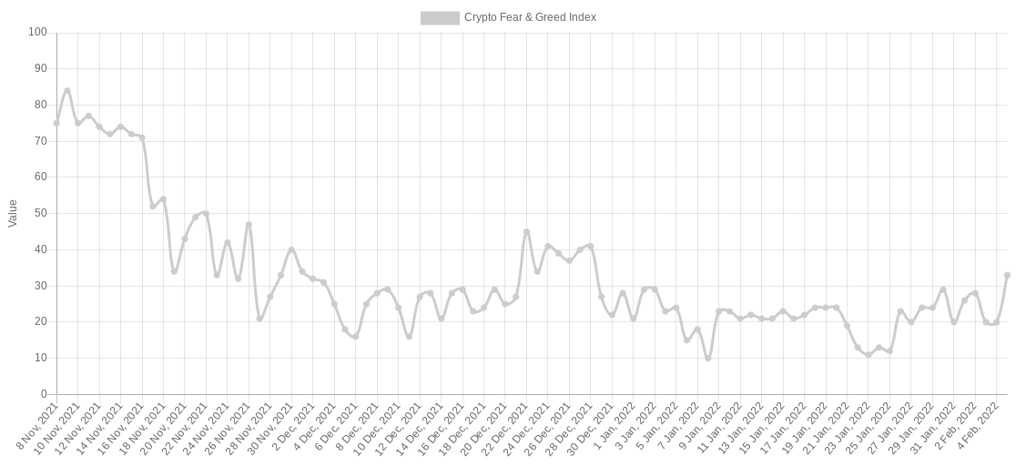 The Index, which uses a basket of factors to produce a nominal sentiment score from 0-100, measured 33 at the time of writing, having spent most of January below 25 — the “extreme fear” zone.