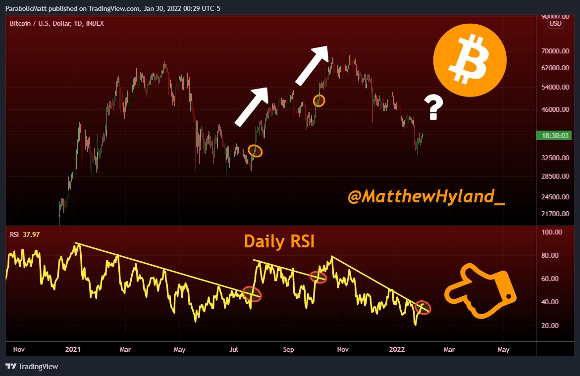 “Looking at $37K to see whether that sustains. If not -> I’m assuming we’ll test lows for daily bullish divergence to create. If we hold, we might see a breaker above $38.5K happening. Weekend times -> boring/trappy.”
