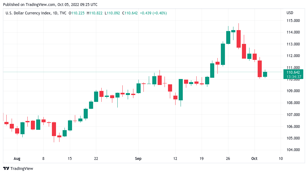DXY circled 110.6 points at the time of writing, having narrowly preserved 110 as support — still marking its lowest levels since Sept. 21.