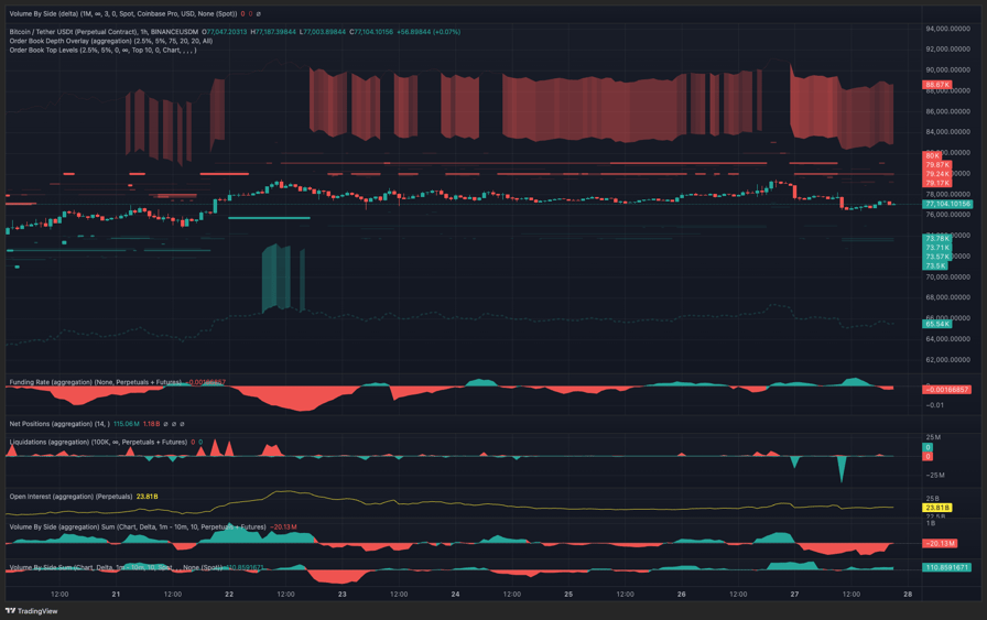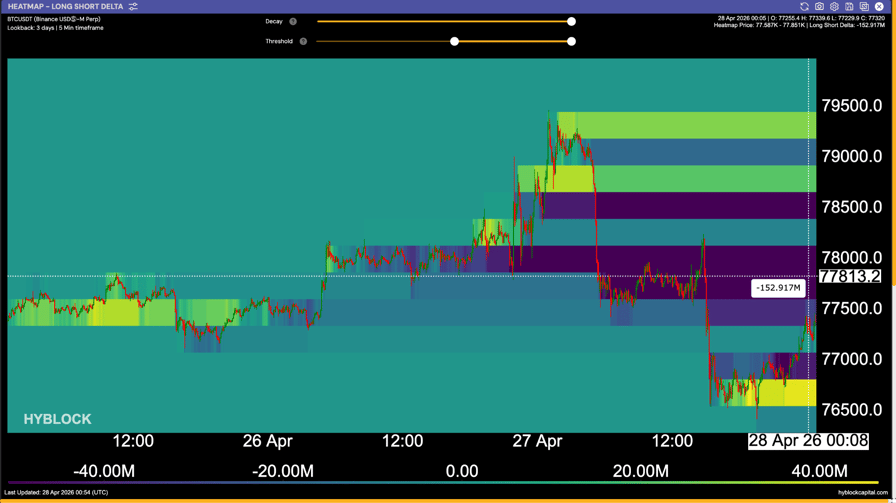Essentially, the SR flip from the Monday US morning session liquidated long positions down to $76,500, potentially confirming the trendline resistance as support. As the price rebounds, the chart shows shorts having significantly more leveraged exposure at risk.