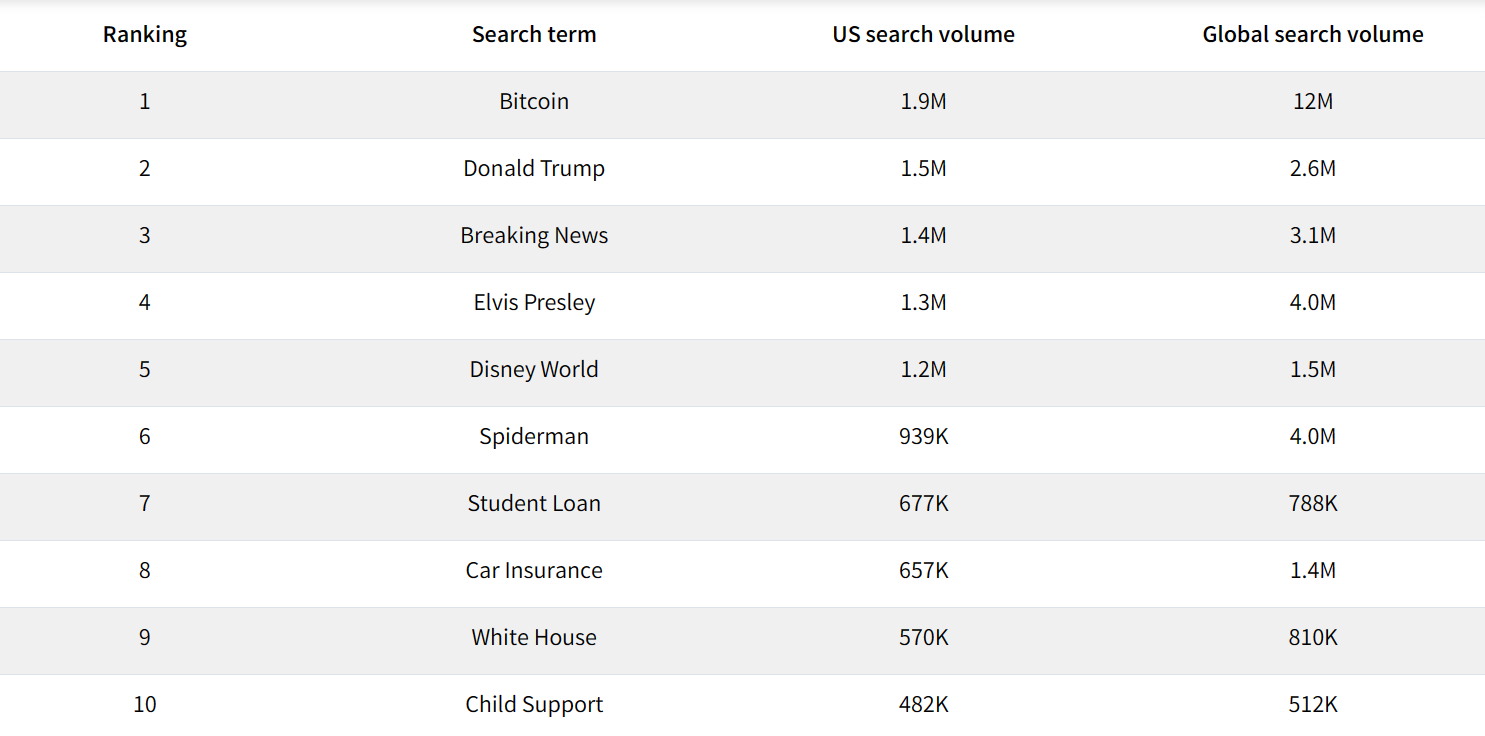 As shown above, other popular terms following Bitcoin and Donald Trump include breaking news, Elvis Presley and Disney World. Previously popular terms such as guns, Chuck Norris, health insurance and politics did not even make it to the top 10 in the list.