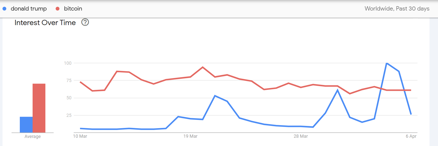 In the last 30 days, Google searches for Donald Trump exceeded Bitcoin for just two days — on April 4 and 5 — when reports of the former president’s possible arrest emerged, according to Google Trends data.