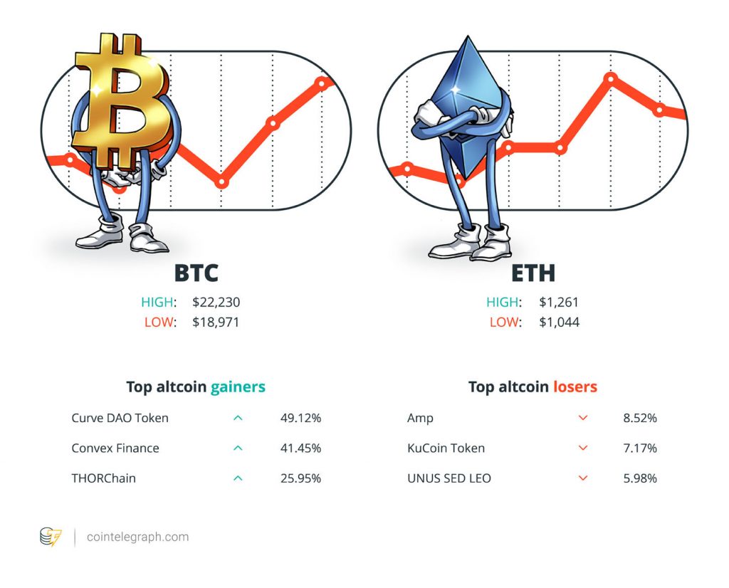 At the end of the week, Bitcoin (BTC) is at $21,804.19, Ether (ETH) at $1,239.99 and XRP at $0.35. The total market cap is at $960.9 billion, according to CoinMarketCap.